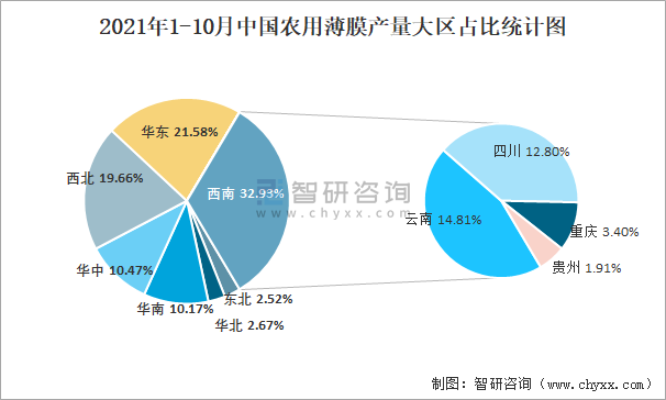 2021年1-10月中國農用薄膜產量大區占比統計圖