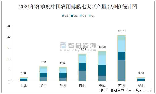 2021年各季度中國農用薄膜七大區產量統計圖