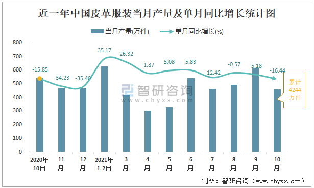 根據(jù)國家統(tǒng)計局?jǐn)?shù)據(jù)顯示:2021年10月中國皮革服裝產(chǎn)量為459萬件,同比下降16.44%;2021年1-10月中國皮革服裝累計產(chǎn)量為4244萬件,同比下降0.92%;2015-2020年中國皮革服裝產(chǎn)量2016年達(dá)到最高,此后逐年遞減。