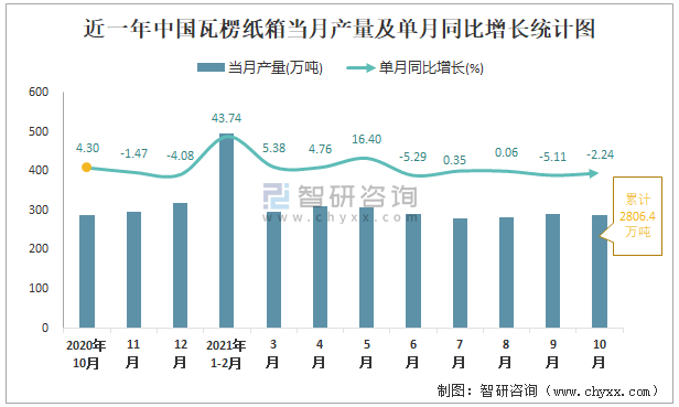 根據國家統計局數據顯示:2021年10月中國瓦楞紙箱產量為289萬噸,同比下降2.24%;2021年1-10月中國瓦楞紙箱累計產量為2806.4萬噸,同比增長6.72%;2015-2020年中國瓦楞紙箱產量2018年跌至最低,次年有所回升。