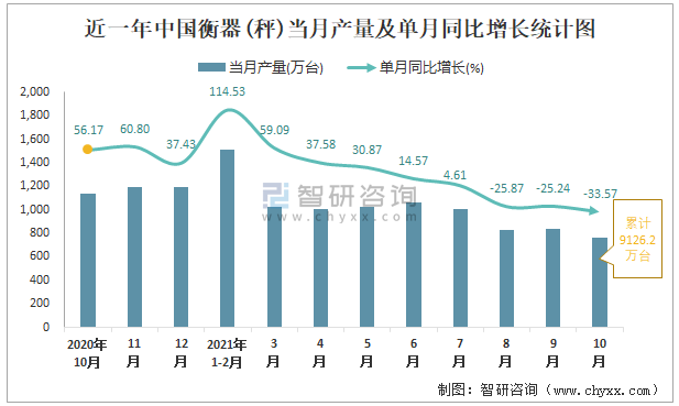 近一年中國衡器(秤)當(dāng)月產(chǎn)量及單月同比增長統(tǒng)計圖