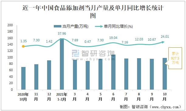 2021年1-10月中國(guó)食品添加劑產(chǎn)量為927.5萬(wàn)噸 同比增長(zhǎng)13.4%