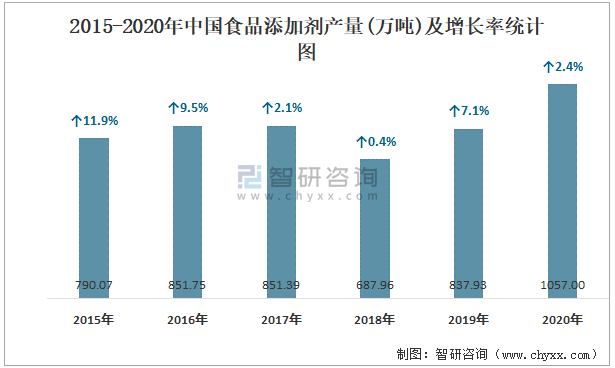 2015-2020年中國(guó)食品添加劑產(chǎn)量及增長(zhǎng)率統(tǒng)計(jì)圖