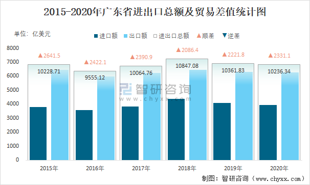 2015-2020年廣東省進出口總額及貿易差值統計圖