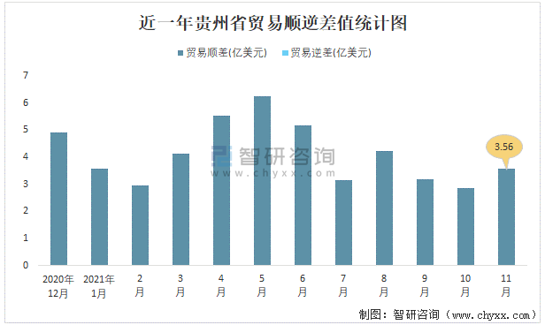 近一年貴州省貿易順逆差值統計圖