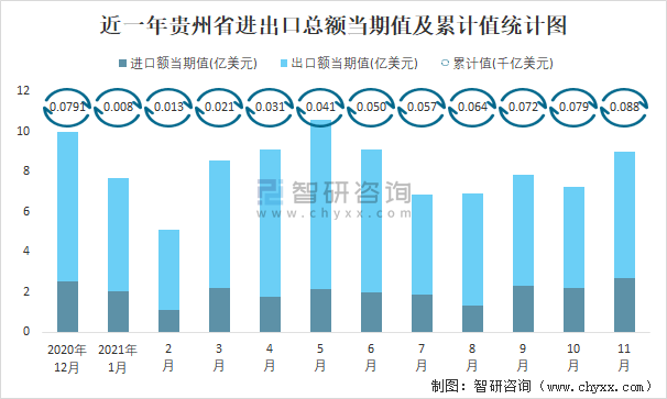 近一年貴州省進出口總額當期值及累計值統計圖
