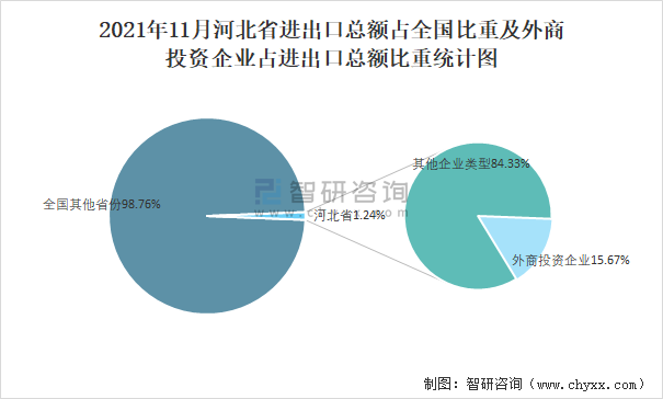 2021年11月河北省進(jìn)出口總額占全國(guó)比重及外商投資企業(yè)占進(jìn)出口總額比重統(tǒng)計(jì)圖