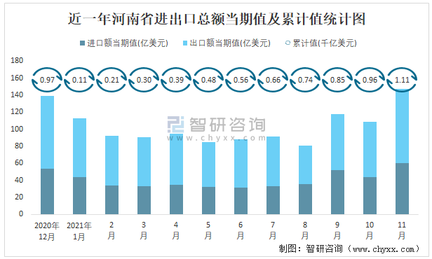近一年河南省進(jìn)出口總額當(dāng)期值及累計(jì)值統(tǒng)計(jì)圖