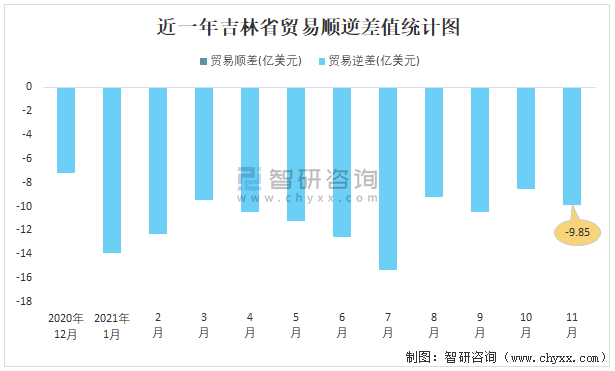 近一年吉林省貿(mào)易順逆差值統(tǒng)計(jì)圖