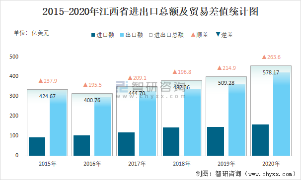 2015-2020年江西省進出口總額及貿易差值統計圖