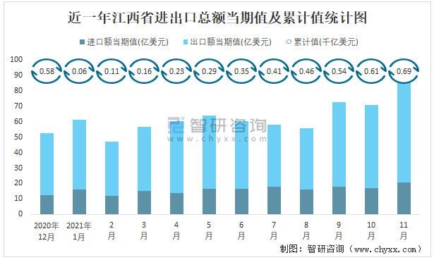 近一年江西省進出口總額當期值及累計值統計圖