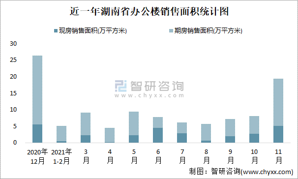 根據國家統計局數據可知:2021年11月湖南省辦公樓銷售面積為19.39萬平方米(其中銷售現房5.1萬平方米,期房14.29萬平方米);2021年1-11月湖南省辦公樓累計銷售面積為82.06萬平方米;近一年湖南省辦公樓期房銷售面積遠高于現房銷售面積。