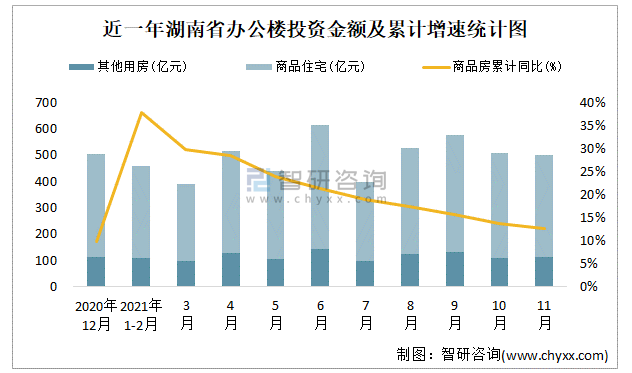 根據國家統計局數據統計可知:2021年11月湖南省房地產開發投資商品房投資金額為501.05億元,其中包括辦公樓、商業營業用房等其他用房114.28億元(注:辦公樓、商業營業用房未分開統計);2021年1-11月湖南省房地產開發投資包括辦公樓在內的其他用房累計金額為1160.4億元。