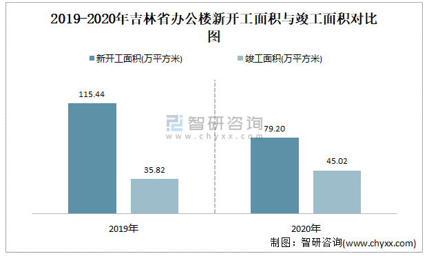 2019-2020年吉林省辦公樓新開工面積與竣工面積對比圖