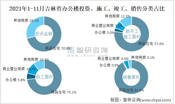 根據國家統計局數據統計可知:2021年1-11月吉林省房地產開發企業在包括辦公樓在內的其他用房投資金額占比為29.1%(注:只有投資金額中其他用房包含辦公樓、商業營業用房),辦公樓的新開工面積與竣工面積所占比重差異不大,從銷售面積來看,辦公樓銷售面積占比少于商業營業用房銷售面積占比。