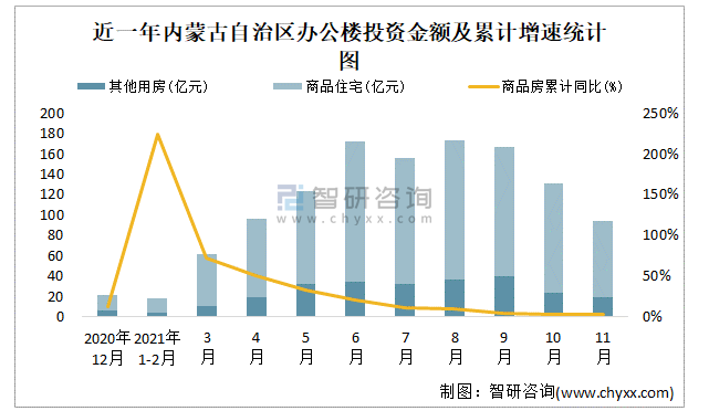 根據國家統計局數據統計可知:2021年11月內蒙古自治區房地產開發投資商品房投資金額為94.67億元,其中包括辦公樓、商業營業用房等其他用房18.97億元(注:辦公樓、商業營業用房未分開統計);2021年1-11月內蒙古自治區房地產開發投資包括辦公樓在內的其他用房累計金額為253.57億元。