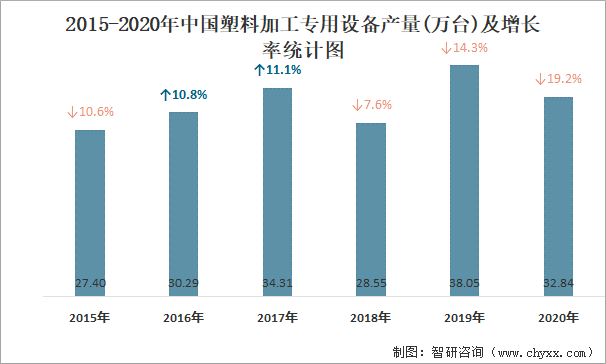 2015-2020年中國塑料加工專用設備產量及增長率統計圖