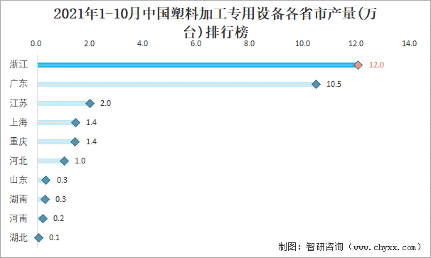 2021年1-10月中國塑料加工專用設備各省市產量排行榜