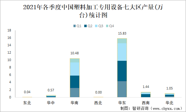 2021年各季度中國塑料加工專用設備七大區產量統計圖