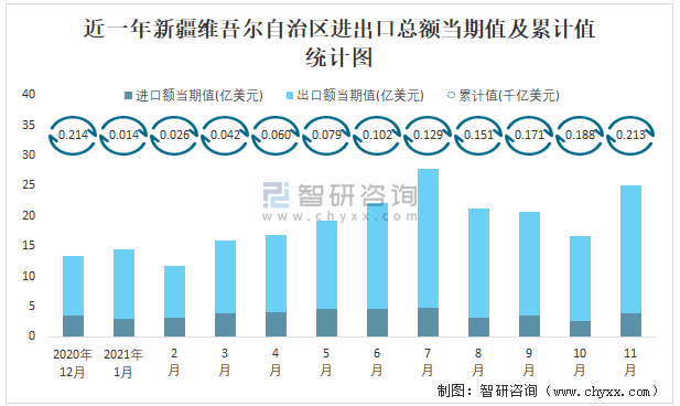 近一年新疆維吾爾自治區(qū)進出口總額當期值及累計值統(tǒng)計圖