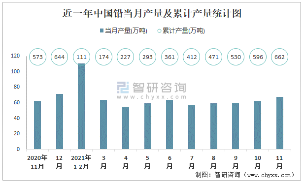 根據國家統計局數據顯示:2021年11月中國鉛產量為67.3萬噸,同比增長7.9%;2021年1-11月中國鉛累計產量為662.4萬噸,累計增長12.4%;2015-2020年中國鉛產量逐年遞增,在2020年達到最高。