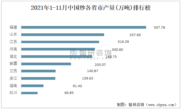根據國家統計局數據顯示:2021年各季度中國紗主要集中在華東、華中、西北地區生產;2021年1-11月中國紗產量大區分布不均衡,其中華東地區產量最高,特別是福建省貢獻了最多產量;2021年1-11月中國紗各省市產量top1領先于其他前9名。