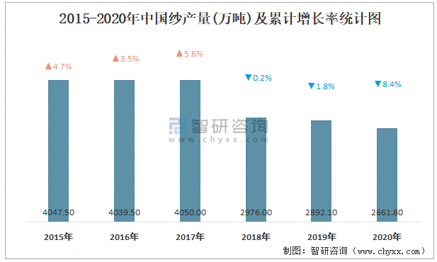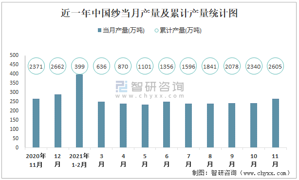 根據國家統計局數據顯示:2021年11月中國紗產量為266萬噸,同比下降0.9%;2021年1-11月中國紗累計產量為2604.6萬噸,累計增長10.1%;2015-2020年中國紗產量2017年達到最高,此后逐年遞減。