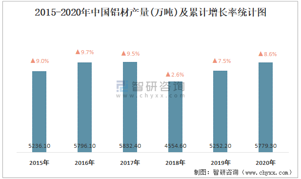 2015-2020年中國鋁材產(chǎn)量及累計增長率統(tǒng)計圖
