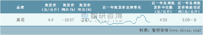 根據農村農業部數據統計可知:2022年第1周全國菜花平均批發價為4.4元/公斤,同比下跌10.57%,環比下跌2.87%,近一年全國菜花平均批發價最高達到8元/公斤,批發價最低也要3.09元/公斤。