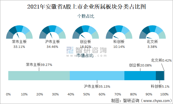 2021年安徽省A股上市企業所屬板塊分類占比圖