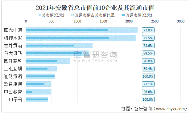 2021年安徽省A股上市總市值前10強企業及其流通市值