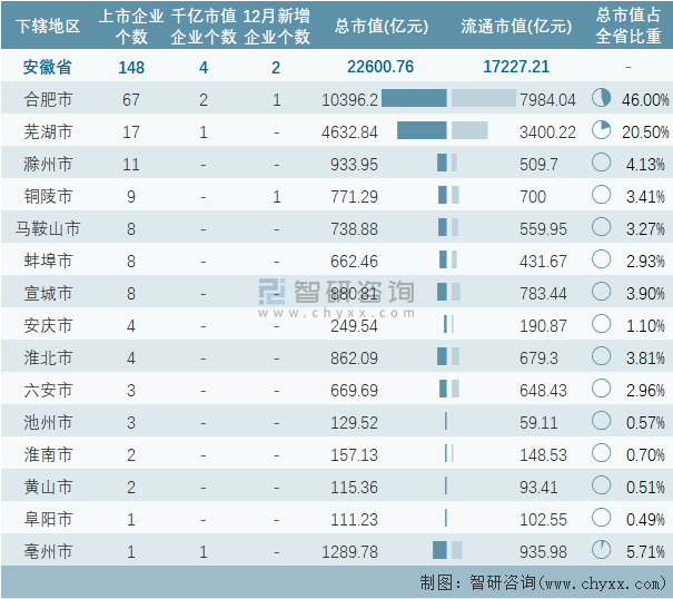 據同花順統計數據可知:截止至2021年12月31日,安徽省的A股上市企業共計148家,上市企業數量排名全國第9,總市值共計22600.76億元,其中建研設計、潔雅股份2家企業為12月新在A股上市的企業;除宿州市1個地級行政區以外,安徽省其他15個地級行政區均有企業在A股上市,其中合肥市上市企業數量最多,為67家;安徽省的A股上市千億市值企業數量在全國排名第8,共計4家,分布在蕪湖市、合肥市、亳州市3個地區,其中合肥市千億市值企業最多,為2家;合肥市A股上市企業總市值總流通市值均為最高。