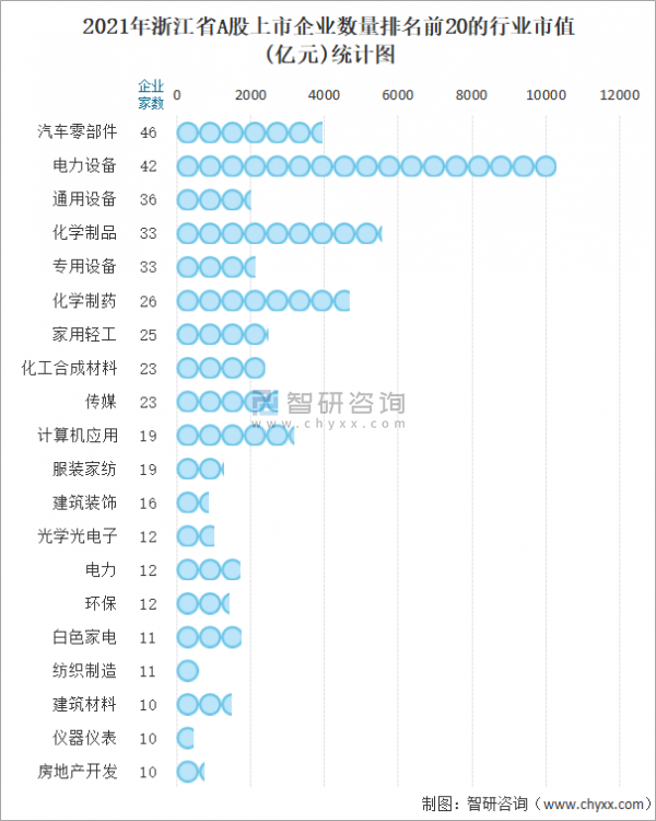 據同花順統計數據可知:浙江省的A股上市企業涵蓋66個行業,其中從事汽車零部件行業的企業最多,有46家,占全省A股上市企業數量比重為7.58%;電力設備行業的總市值最高,其總市值為10282.17億元,占全省A股上市企業總市值比重為11.95%。
