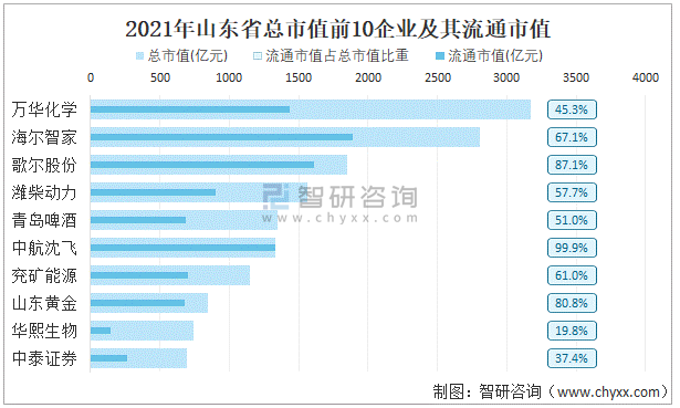 2021年山東省A股上市總市值前10強企業及其流通市值