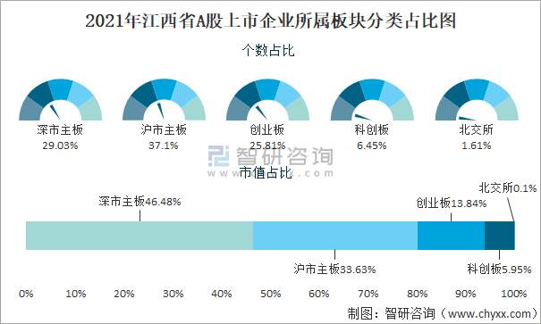 據同花順統計數據可知:截止至2021年12月31日,江西省A股上市企業中在滬市主板上市的企業數量最多,為23家,占全省A股上市企業數量比重為37.1%,在深市主板上市的企業總市值最高,共計4191.78億元,占全省A股上市企業總市值比重為46.48%。
