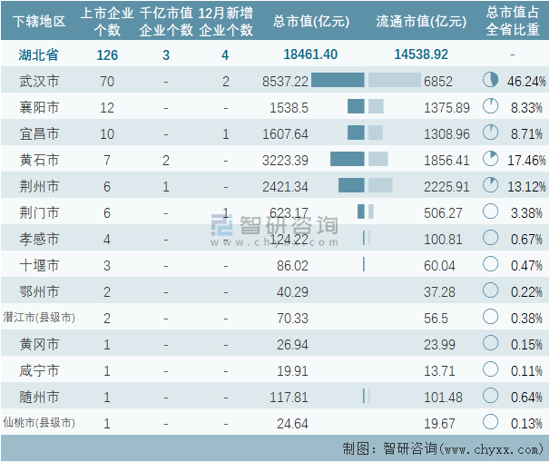 據(jù)同花順統(tǒng)計數(shù)據(jù)可知:截止至2021年12月31日,湖北省的A股上市企業(yè)共計126家,上市企業(yè)數(shù)量排名全國第11,總市值共計18461.4億元,其中光庭信息、亨迪藥業(yè)、C天源、華強科技4家企業(yè)為12月新在A股上市的企業(yè);除恩施州1個地級行政區(qū)以外,湖北省其他12個地級行政區(qū)均有企業(yè)在A股上市,其中武漢市上市企業(yè)數(shù)量最多,為70家,此外,潛江、仙桃2個直轄縣級市均有企業(yè)已在A股上市;湖北省的A股上市千億市值企業(yè)數(shù)量在全國排名第13,共計3家,分布在荊州市、黃石市2個地區(qū),其中黃石市千億市值企業(yè)最多,為2家;武漢市A股上市企業(yè)總市值總流通市值均為最高。