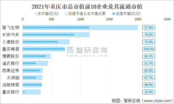 2021年重慶市A股上市總市值前10強企業(yè)及其流通市值