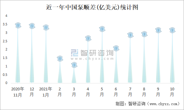 近一年中國泵順差(億美元)統計圖
