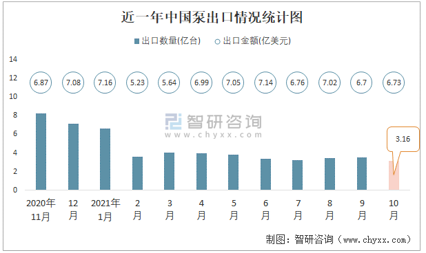 2021年10月中國泵進出口數量分別為0.07億臺和3.16億臺