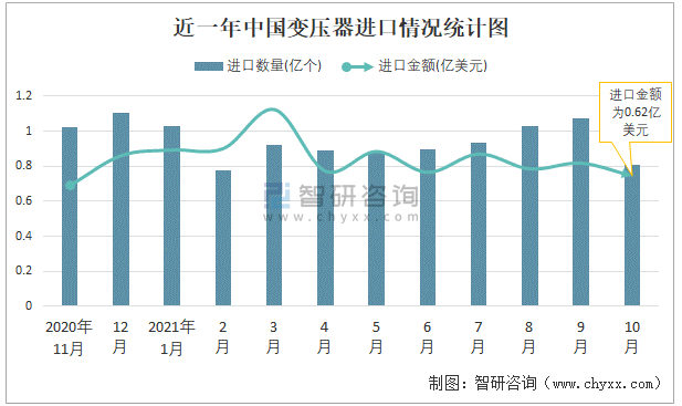根據(jù)中國(guó)海關(guān)數(shù)據(jù)顯示:2021年10月中國(guó)變壓器進(jìn)口數(shù)量為0.81億個(gè),同比下降14.1%,進(jìn)口金額為0.62億美元,同比增長(zhǎng)20.3%,2021年10月中國(guó)變壓器出口數(shù)量為2.77億個(gè),同比增長(zhǎng)8.2%,出口金額為2.92億美元,同比增長(zhǎng)8.8%;2021年1-10月中國(guó)變壓器進(jìn)口數(shù)量為9.24億個(gè),進(jìn)口金額為7.13億美元,出口數(shù)量為27.56億個(gè),出口金額為28.9億美元。