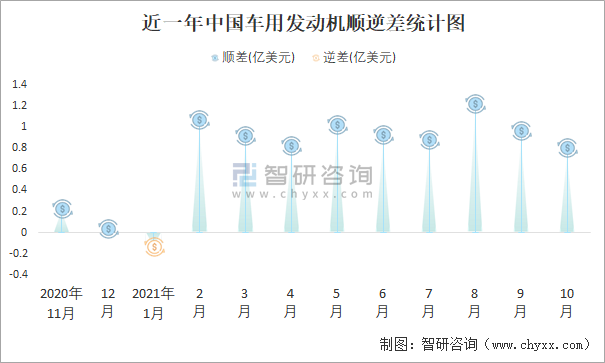 近一年中國(guó)車用發(fā)動(dòng)機(jī)順逆差統(tǒng)計(jì)圖