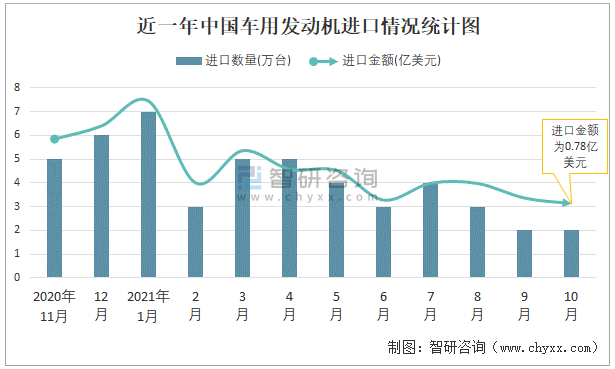 根據(jù)中國(guó)海關(guān)數(shù)據(jù)顯示:2021年10月中國(guó)車用發(fā)動(dòng)機(jī)進(jìn)口數(shù)量為2萬(wàn)臺(tái),同比下降70%,進(jìn)口金額為0.78億美元,同比下降54.8%,2021年10月中國(guó)車用發(fā)動(dòng)機(jī)出口數(shù)量為25萬(wàn)臺(tái),同比下降22.4%,出口金額為1.58億美元,同比下降10.1%;2021年1-10月中國(guó)車用發(fā)動(dòng)機(jī)進(jìn)口數(shù)量為38萬(wàn)臺(tái),進(jìn)口金額為10.88億美元,出口數(shù)量為300萬(wàn)臺(tái),出口金額為19.33億美元。