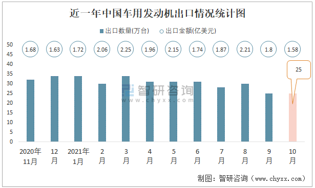 近一年中國(guó)車用發(fā)動(dòng)機(jī)出口情況統(tǒng)計(jì)圖