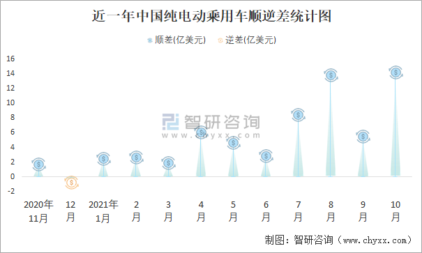根據(jù)中國(guó)海關(guān)數(shù)據(jù)顯示:近一年中國(guó)純電動(dòng)乘用車進(jìn)口金額總體小于出口金額,進(jìn)出口貿(mào)易以順差為主,10月順差規(guī)模大幅度擴(kuò)大。