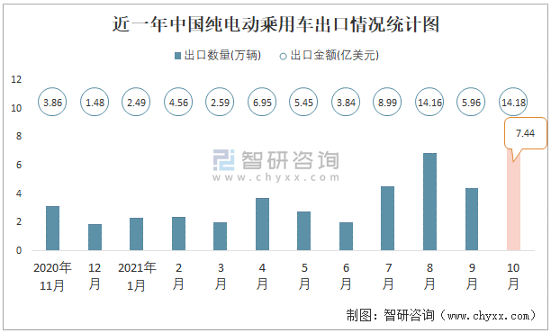 近一年中國(guó)純電動(dòng)乘用車出口情況統(tǒng)計(jì)圖