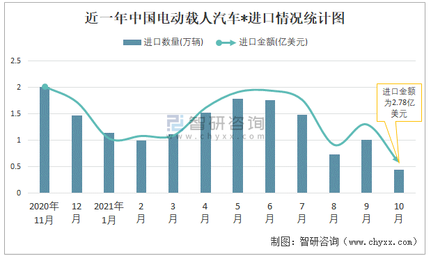 近一年中國電動載人汽車進口情況統計圖