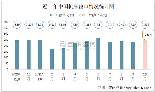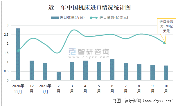 根據中國海關數據顯示:2021年10月中國機床進口數量為0.81萬臺,同比增長19%,進口金額為5.98億美元,同比增長20.7%,2021年10月中國機床出口數量為269.4萬臺,同比增長39.2%,出口金額為7.59億美元,同比增長27.2%;2021年1-10月中國機床進口數量為9.13萬臺,進口金額為68.42億美元,出口數量為2306.12萬臺,出口金額為69.57億美元。