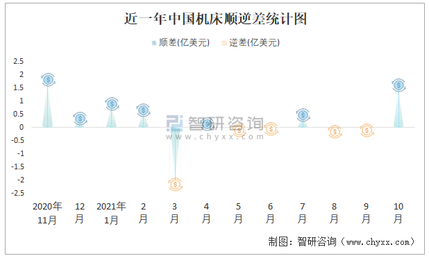 根據中國海關數據顯示:近一年中國機床進口金額總體小于出口金額,進出口貿易以順差為主,10月由逆差轉為順差。