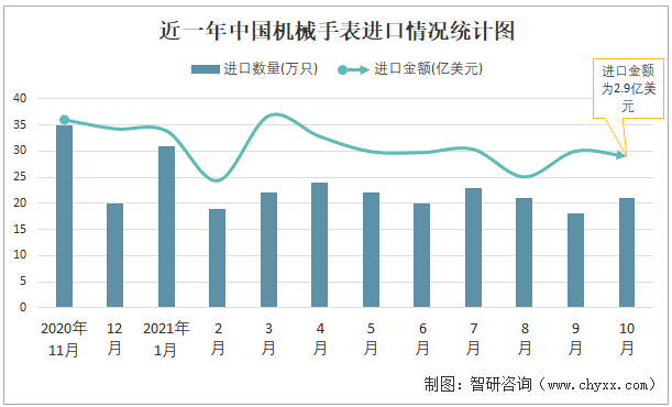 根據中國海關數據顯示:2021年10月中國機械手表進口數量為21萬只,同比下降24%,進口金額為2.9億美元,同比增長32.1%,2021年1-10月中國機械手表進口數量為220萬只,進口金額為30.16億美元。