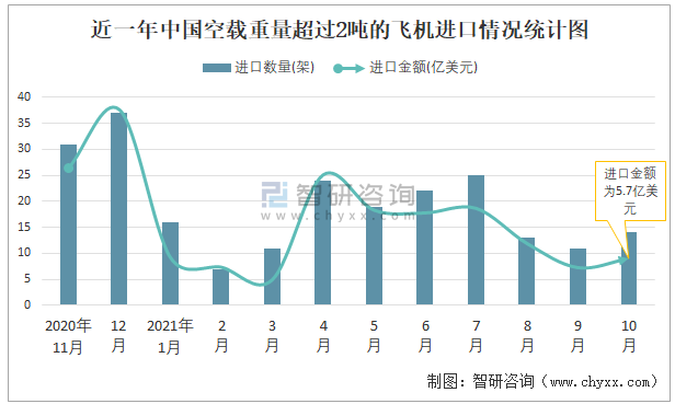 根據中國海關數據顯示:2021年10月中國空載重量超過2噸的飛機進口數量為14架,同比下降41.7%,進口金額為5.7億美元,同比下降28.8%,2021年1-10月中國空載重量超過2噸的飛機進口數量為162架,進口金額為81.53億美元。